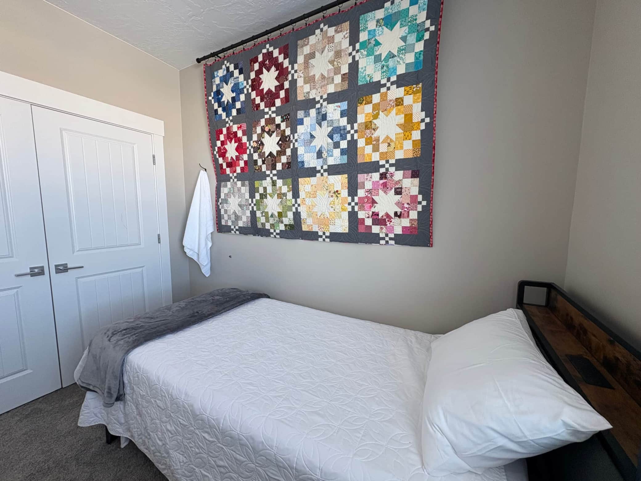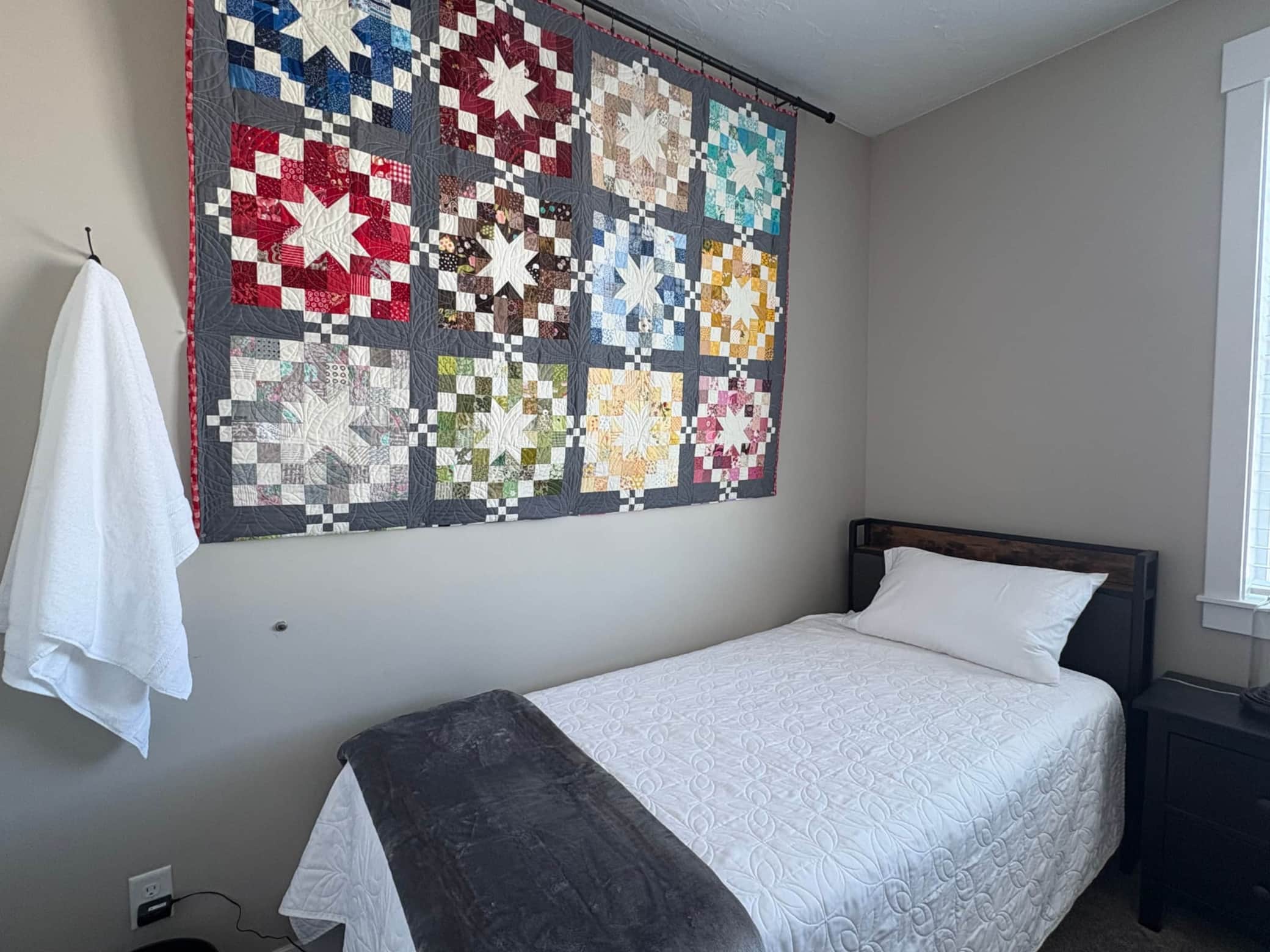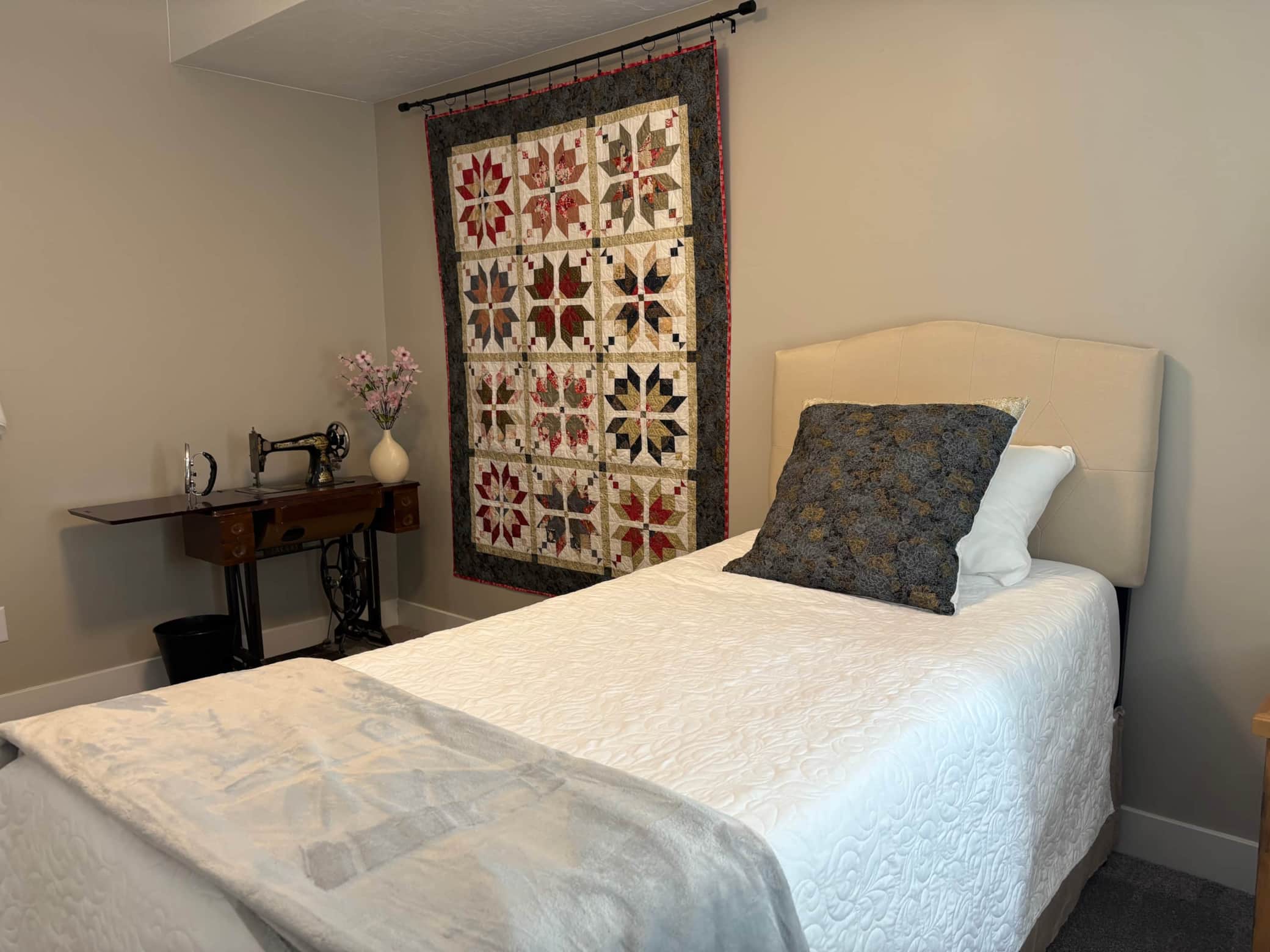 The Gilded Star Room is a warm, refined retreat that celebrates classic quilting with a touch of elegance. A stunning star quilt-featuring soft creams, deep reds, charcoal, and a subtle gold accents-hangs on the wall as the focal point, bringing depth and artistry to the space. The room features a comfortable Twin XL bed dressed in crisp white bedding, creating a peaceful contrast to the quilt's rich tones. This room is perfect for a solo guest who appreciates traditional design, quiet comfort, and a serene place to unwind after a day of creative work.
