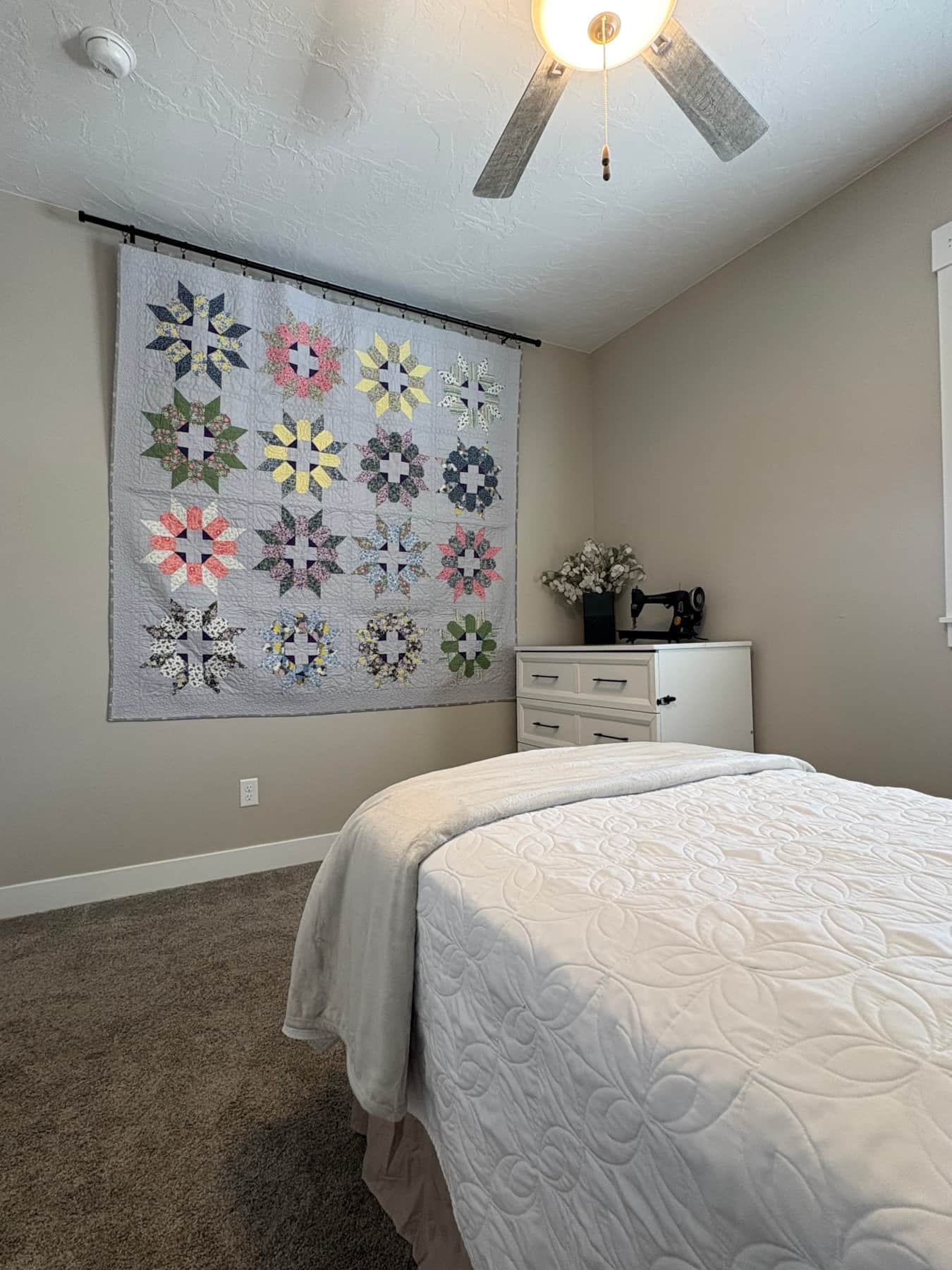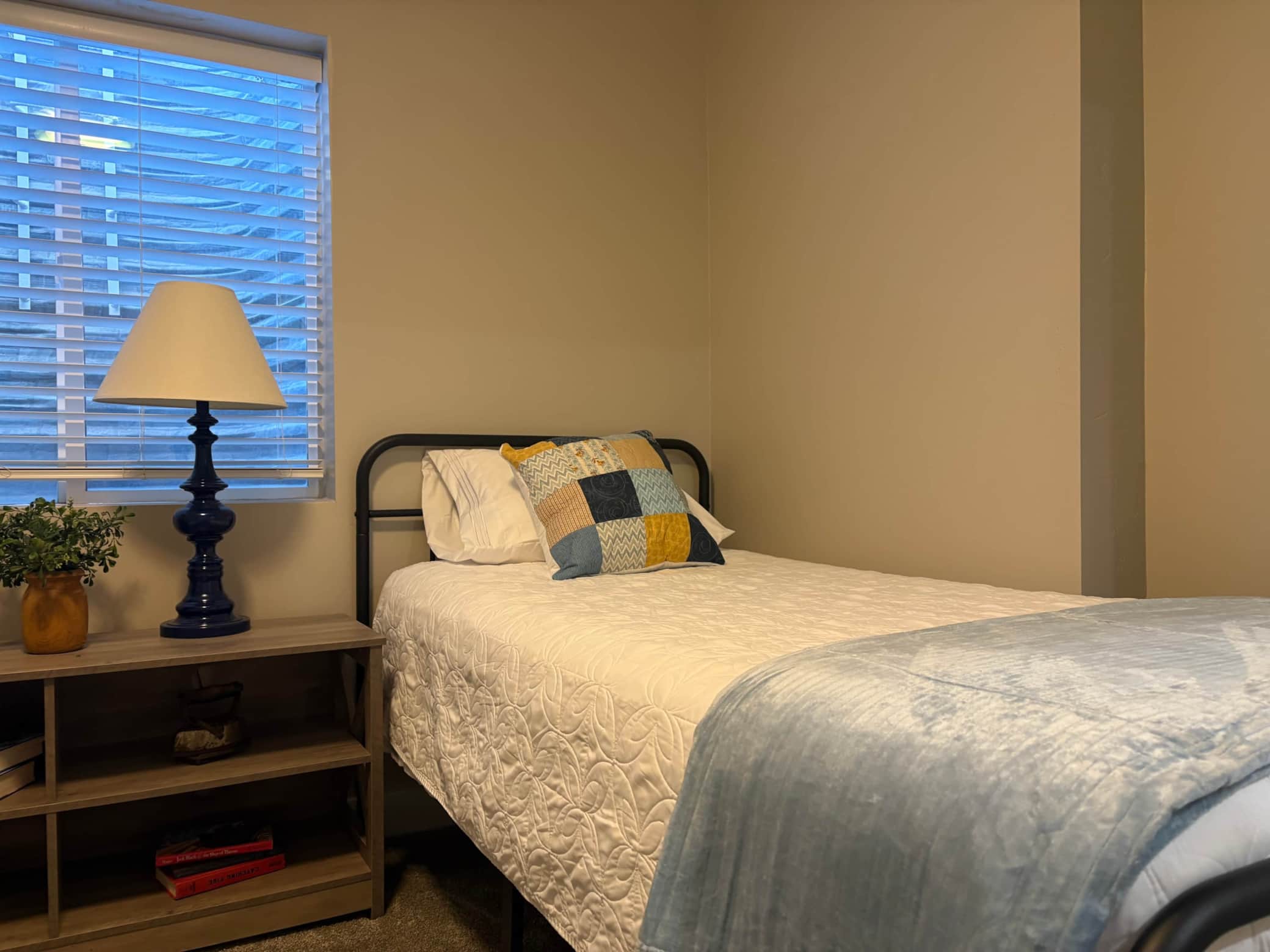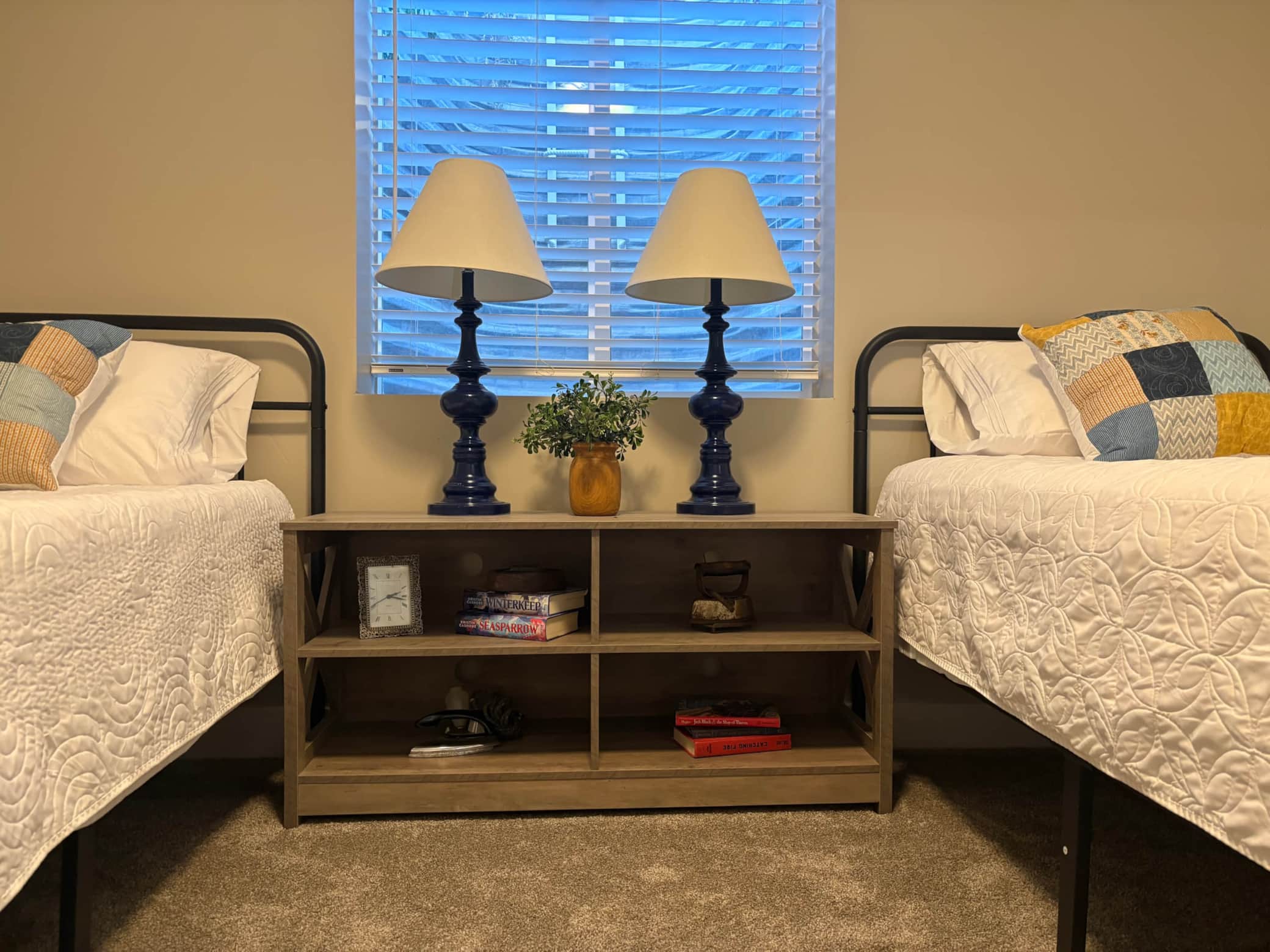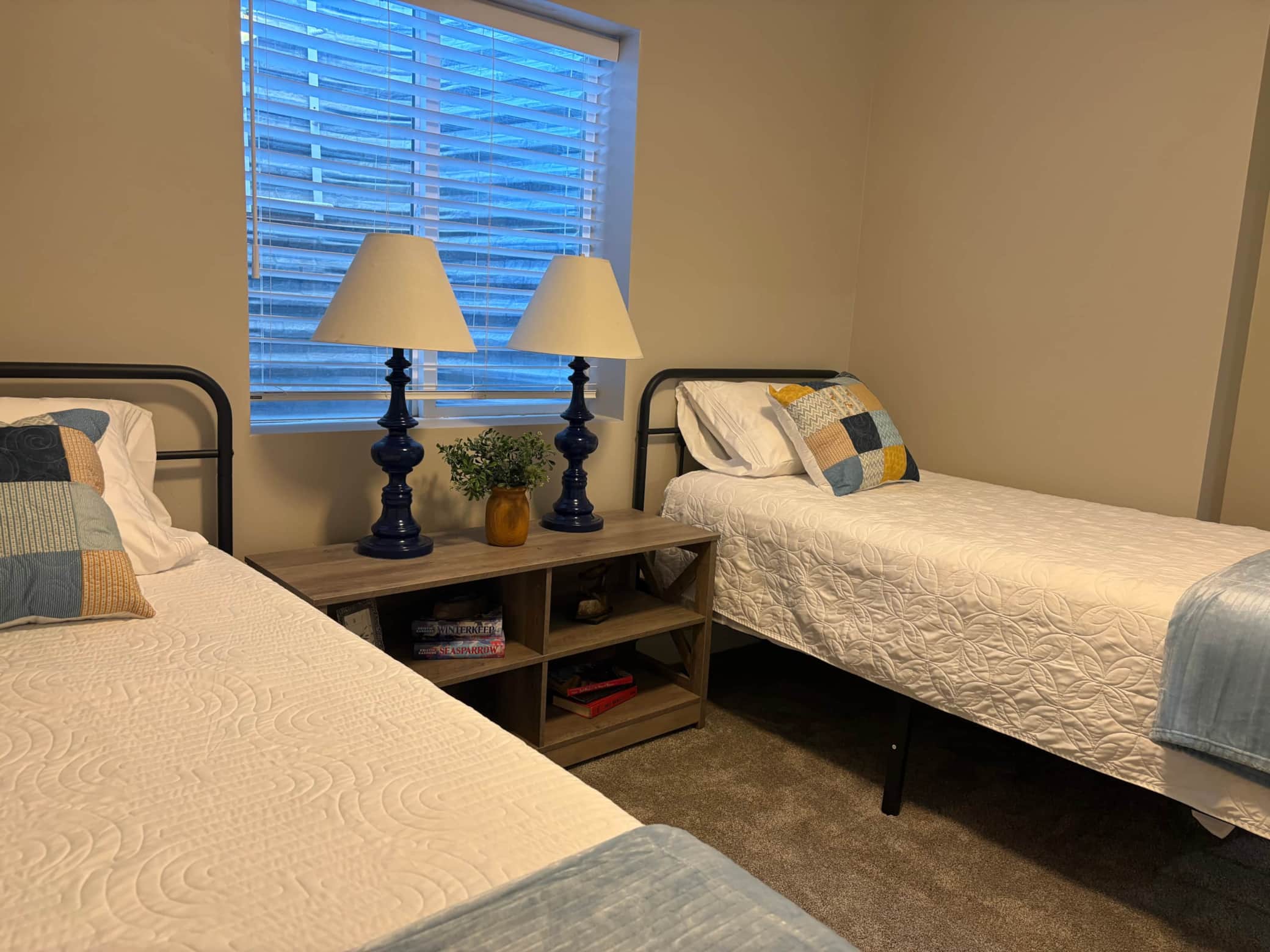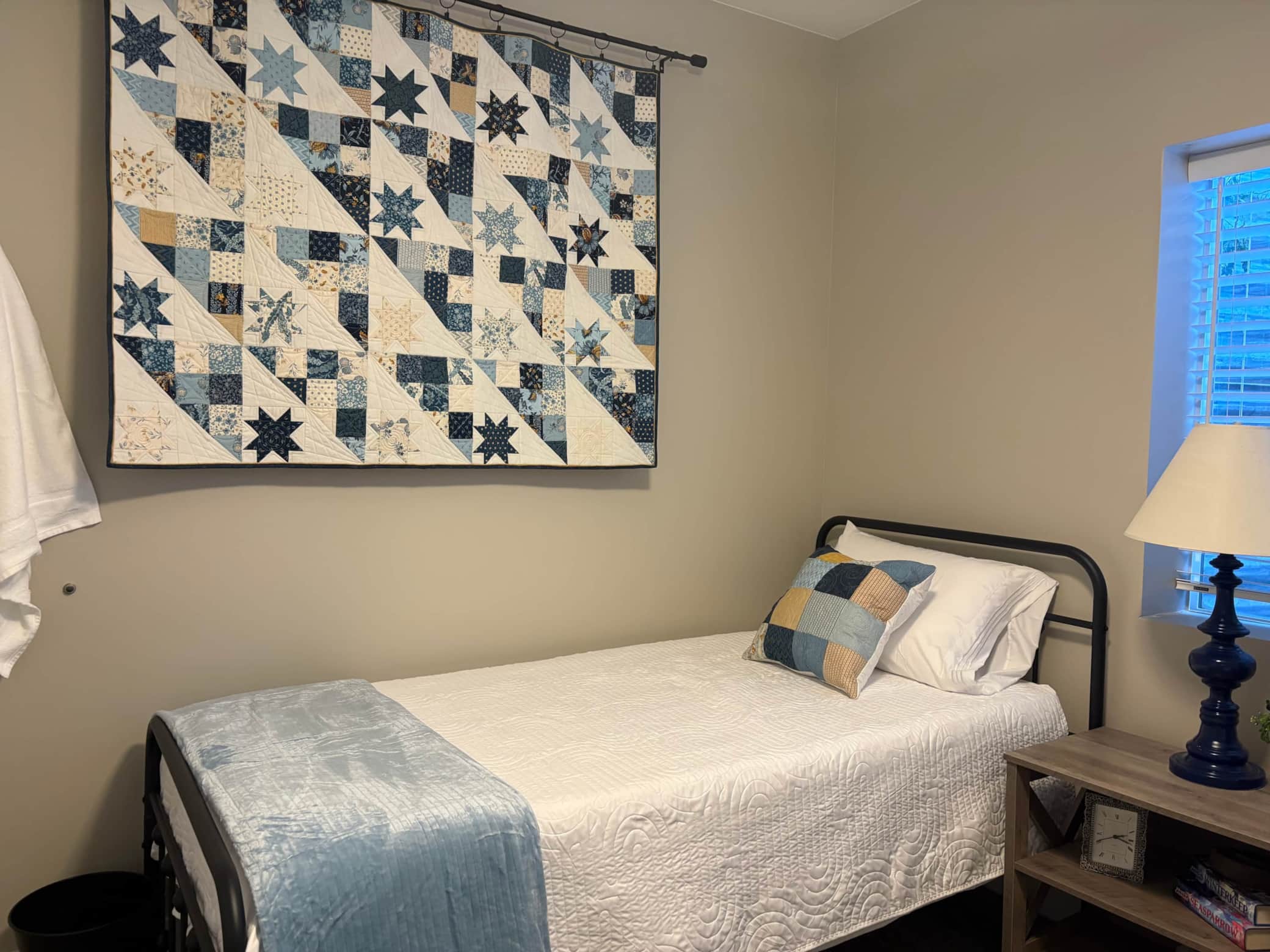 This cozy twin guest room features two comfortable Twin XL beds and a calm, inviting layout-perfect for retreat guests sharing a space. Crisp white bedding and simple furnishings create a restful atmosphere, while a handcrafted star quilt displayed on the wall adds warmth, inspiration, and classic quilting charm. Designed for comfort and creativity, this room is an ideal place to unwind after a full day of sewing and connection.