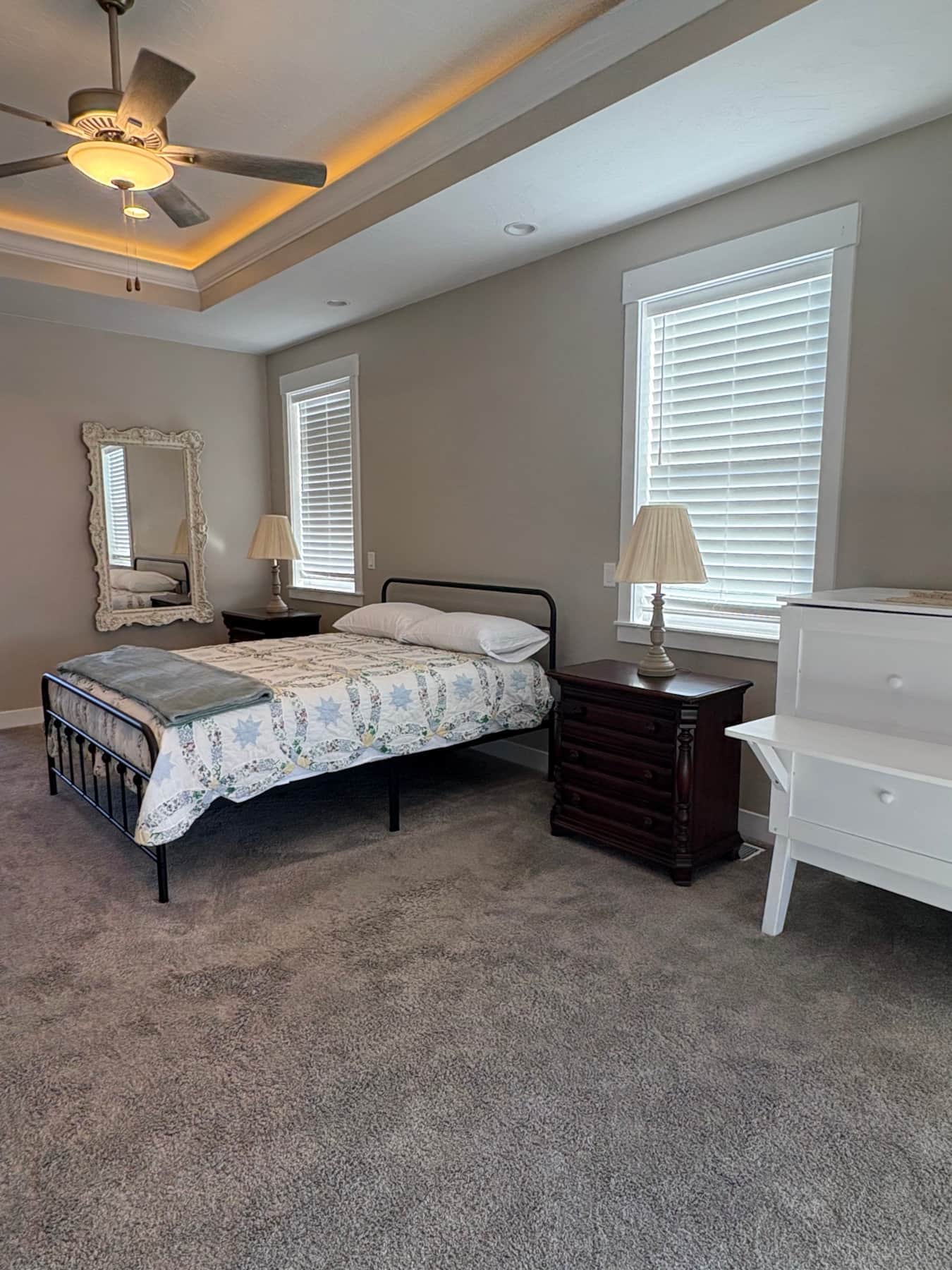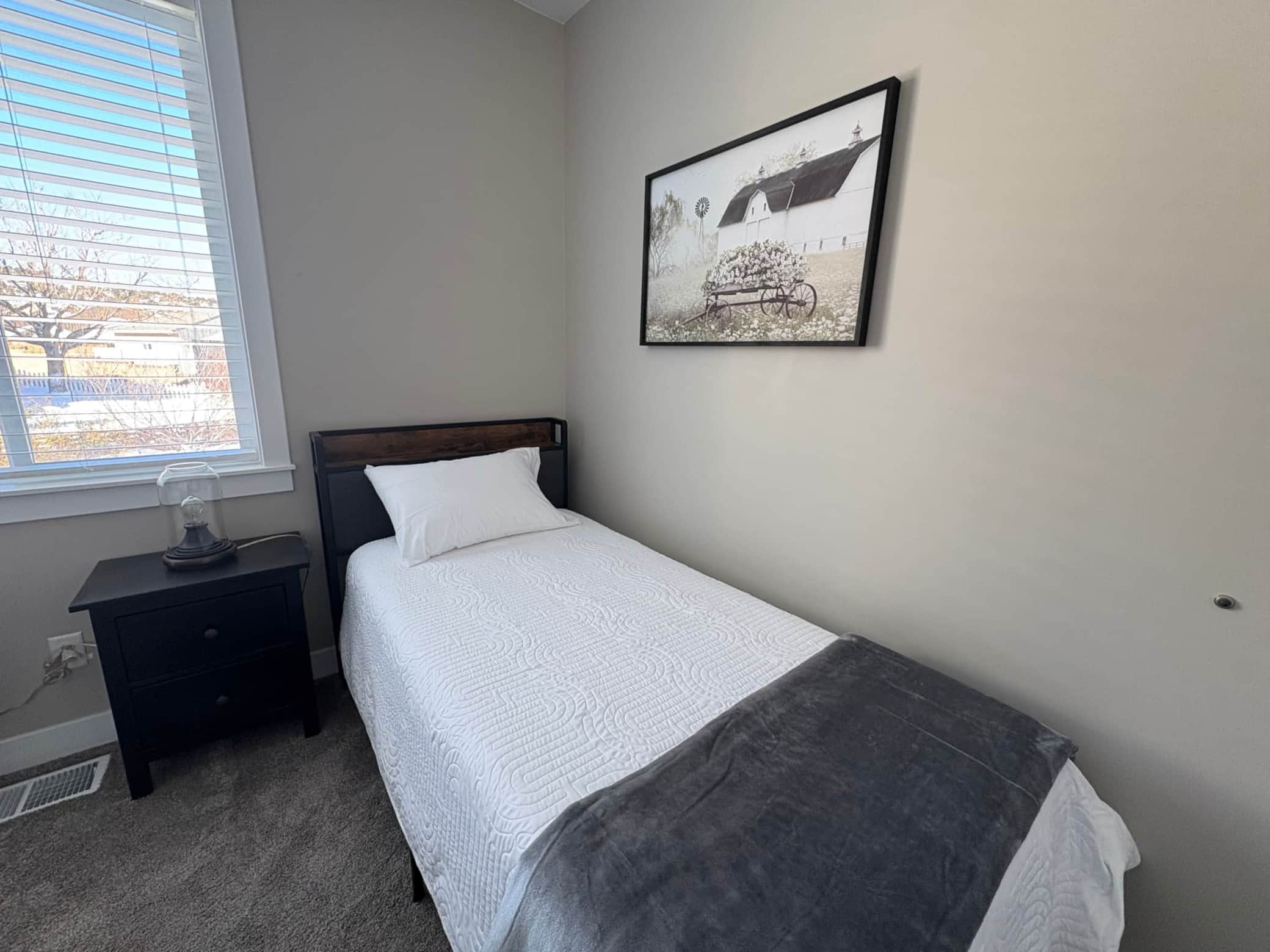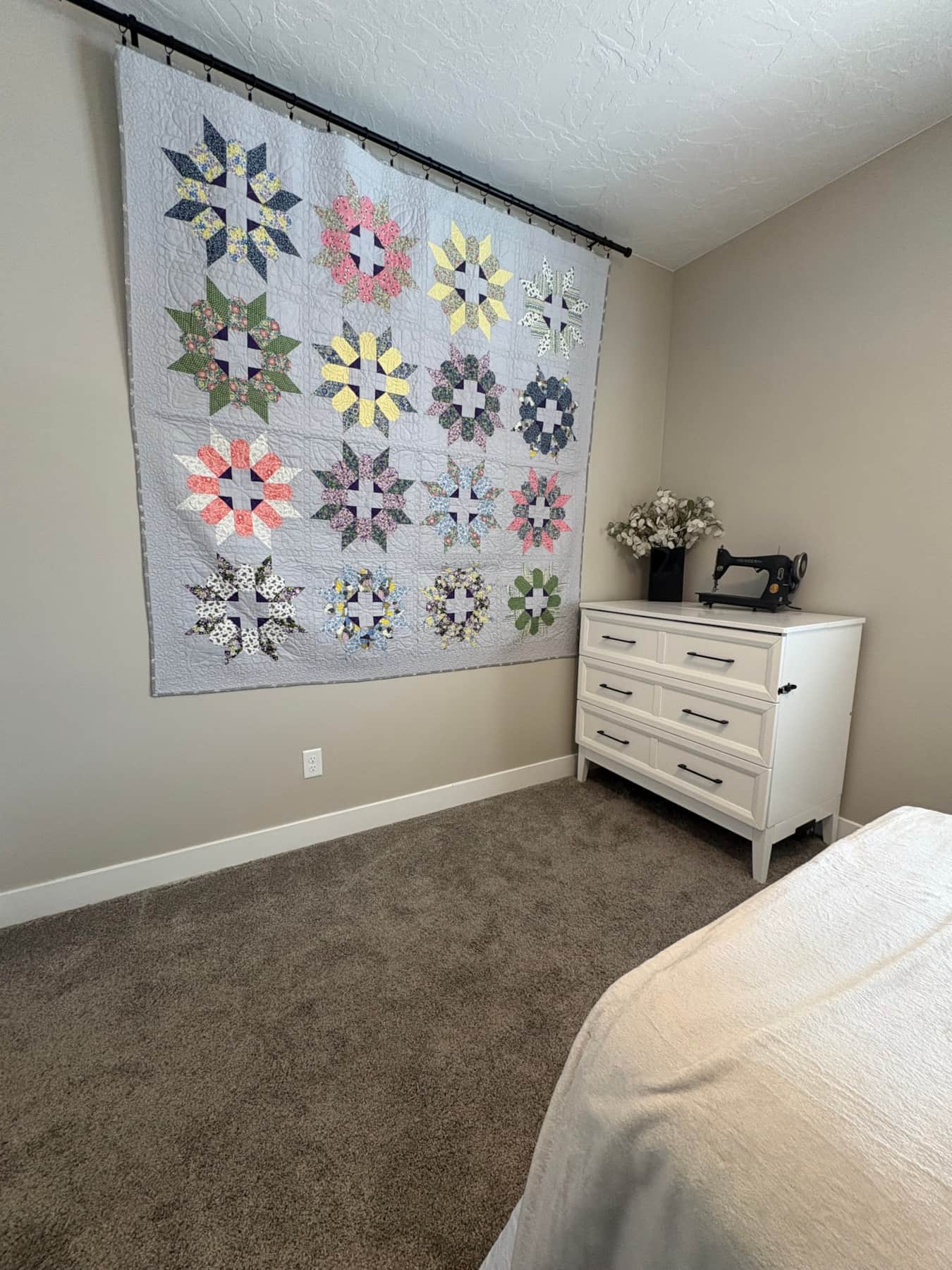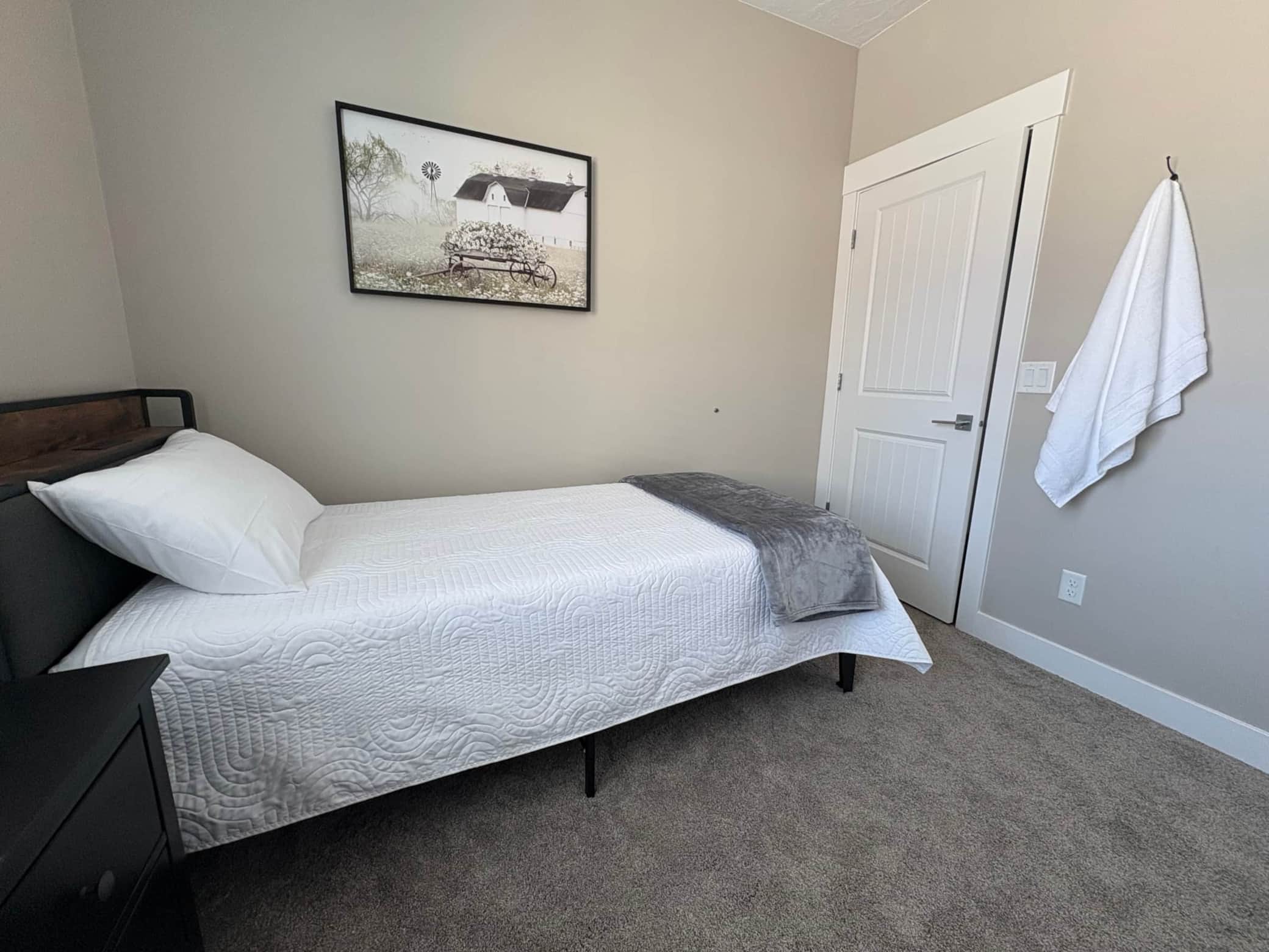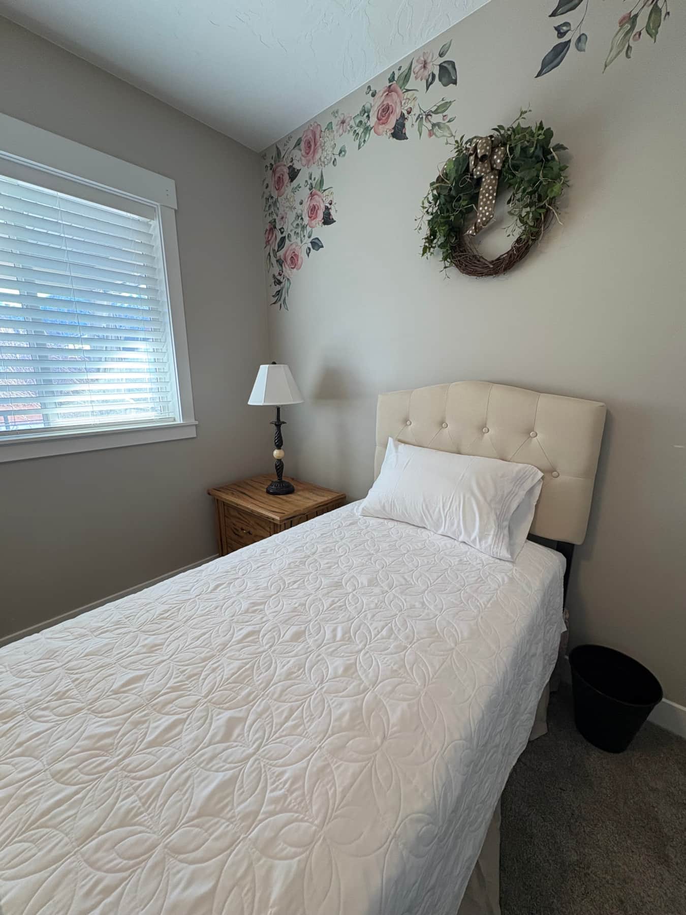 This cozy twin guest room features two comfortable Twin XL beds and a calm, inviting layout-perfect for retreat guests sharing a space. Crisp white bedding and simple furnishings create a restful atmosphere, while a handcrafted star quilt displayed on the wall adds warmth, inspiration, and classic quilting charm. Designed for comfort and creativity, this room is an ideal place to unwind after a full day of sewing and connection.