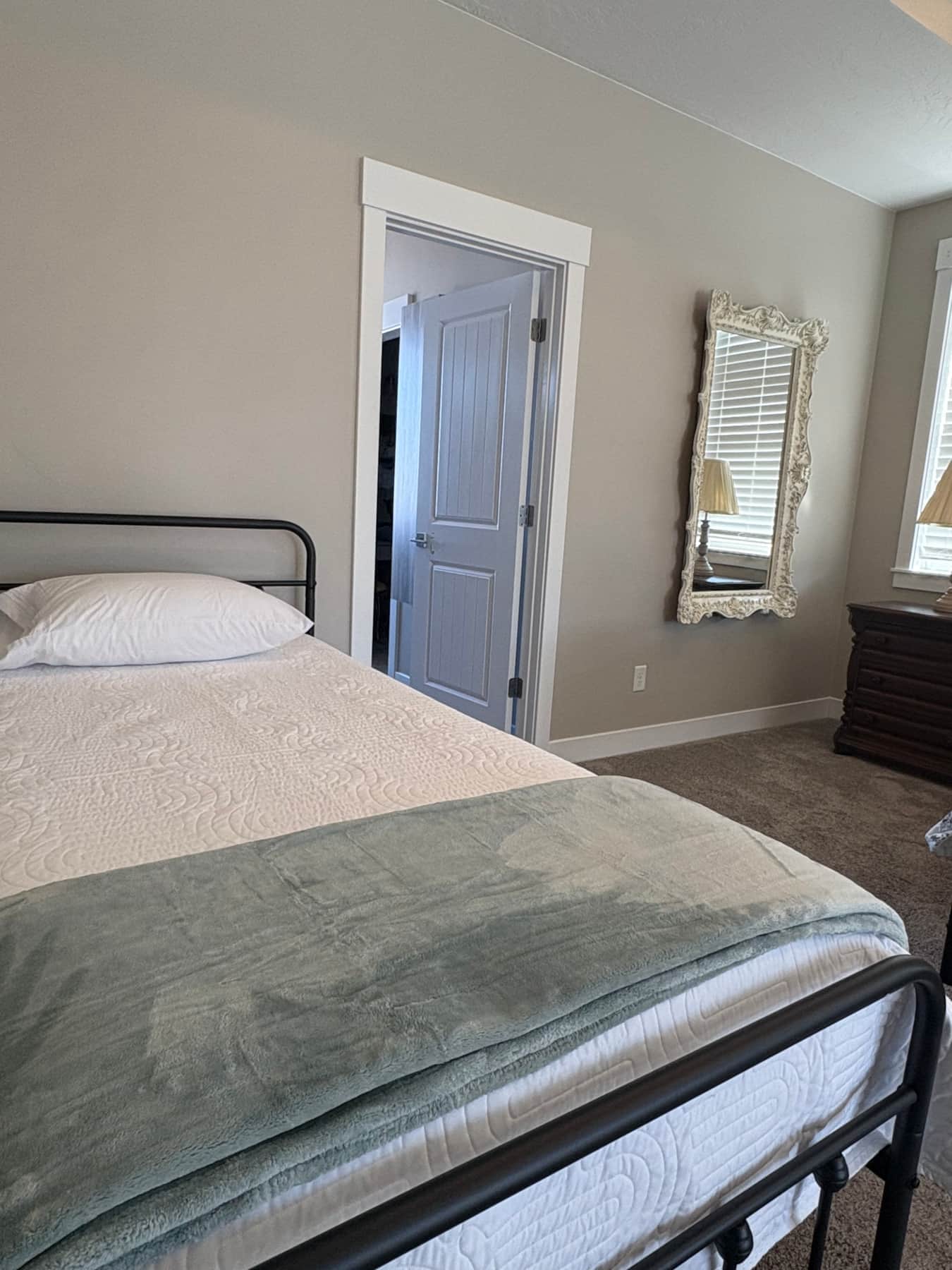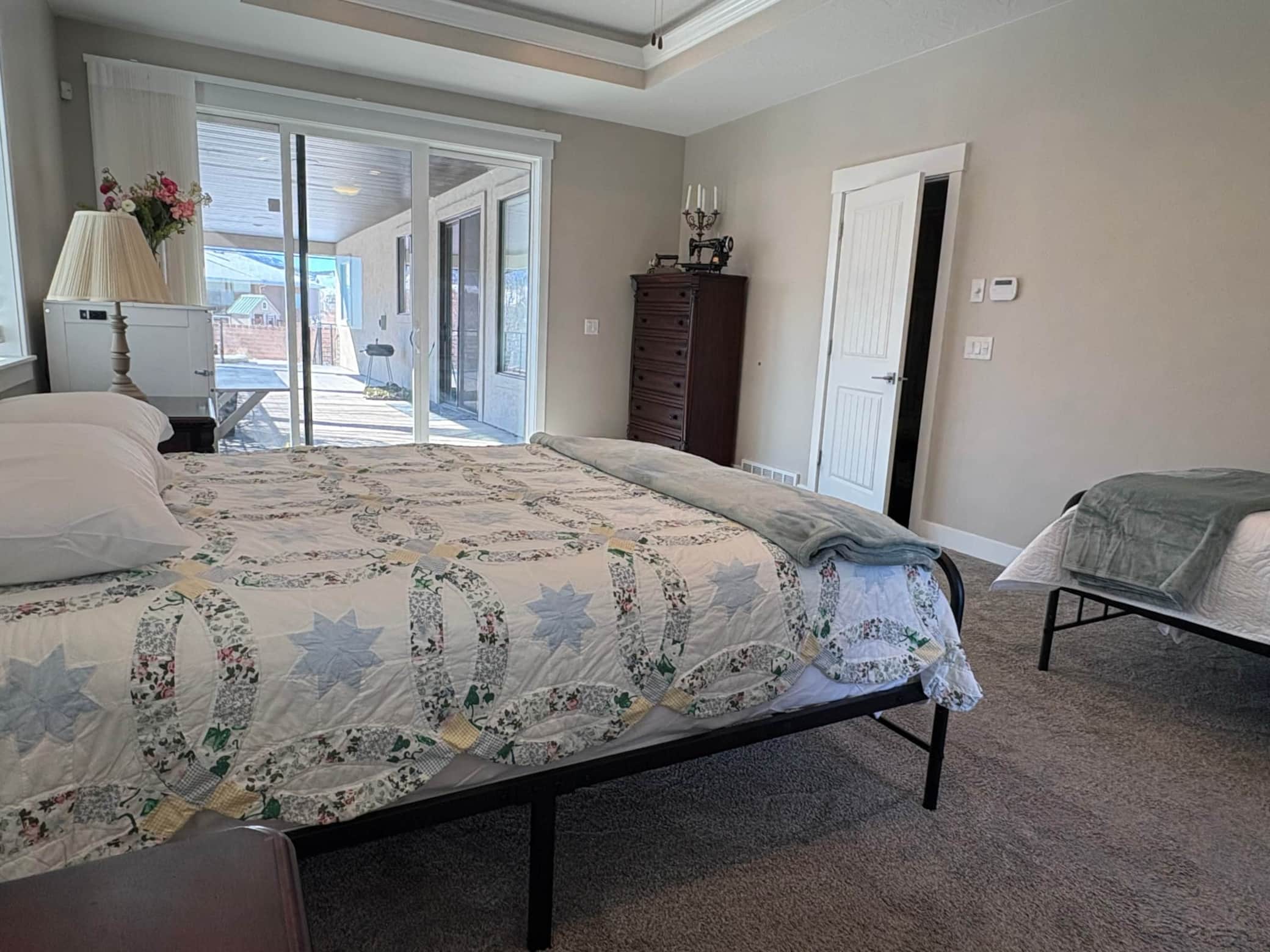 The Grand Maker's Suite is the most spacious and versatile room in the retreat, thoughtfully designed for comfort, flexibility, and a touch of luxury. The suite features a soft, inviting queen bed with a black metal frame, paired with a matching, firm, Twin XL-perfect for guests with different sleep preferences. A full size Murphey bed provides additional sleeping space when needed, making this suite ideal for small groups or hosts.
