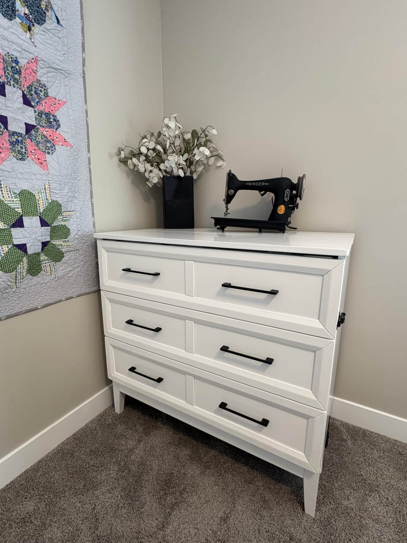 The room features a comfortable Twin XL bed and a twin Murphy bed, both dressed in crisp white bedding—fresh, calm, and perfect for a restful night after a full day of sewing and creativity. A vintage Singer sewing machine adds character and nostalgia, honoring the art of quilting and the makers who came before us.