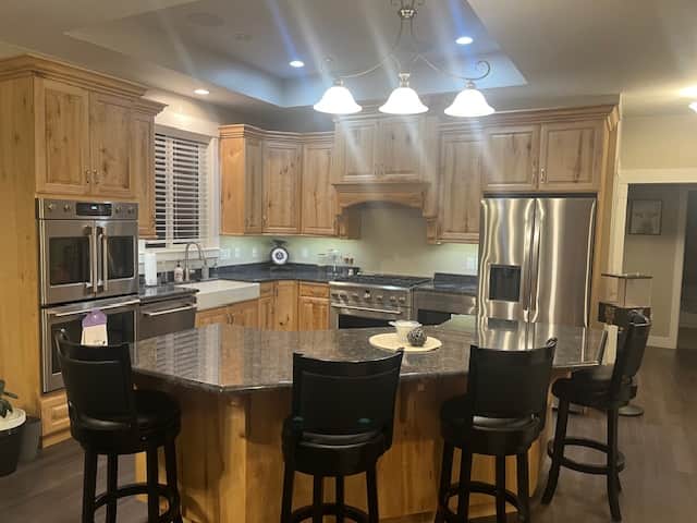Our spacious chef’s kitchen is designed to make cooking for a group easy and enjoyable. Featuring three ovens, a gas range, farmhouse sink, microwave drawer, and a large French-door refrigerator, there’s plenty of room and equipment for everything from quick breakfasts to shared dinners. The kitchen is fully stocked with essential cookware and gadgets, so you’ll have what you need to prepare your favorite meals.